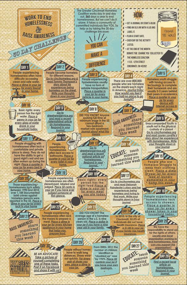 The 30 Day Challenge is an easy way for people to get involved and to be educated about the realities of homelessness. Just print the challenge, encourage others to participate with you and then simply mail in your donations for the 30 days to 113 E 12th Street, Cincinnati Ohio 45202.
