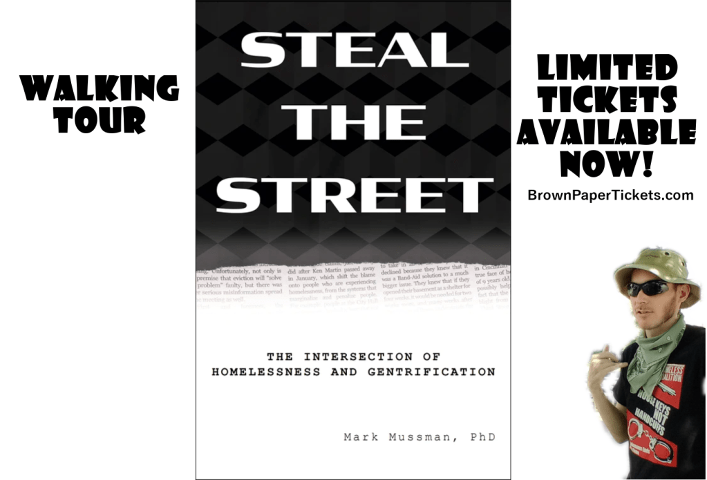 On July 15th at 10 am, join Homeless Coalition’s Director of Education and author of Steal the Street, Dr. Mark Mussman, on a special 2-hour walking tour of Over-the-Rhine, the West End and Downtown Cincinnati, that focuses on the actions, events, and development, as well as, the author’s understanding of gentrification and homelessness.