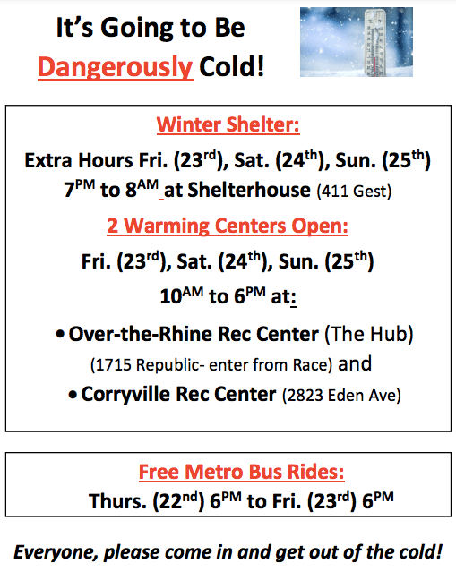 Update: SORTA will be making bus rides free from today at 6PM through tomorrow (Friday) at 6PM. An updated flyer for hanging and distribution that includes the shelter, warming centers and bus info is attached here. Please see below for the original announcement.